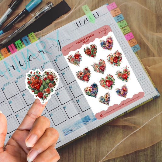 Beautiful Vintage Floral Heart Sticker Sheet, Handmade cute Vinyl Sticker for gift, planner, book and laptop stickers