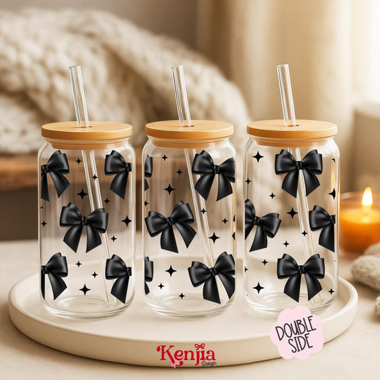 Black Bows 16 OZ Glass Can With Lid & Straw / Coquette Wrap / Water Bottle / Bookish Merch / UV Dtf Libbey Wrap Transfert