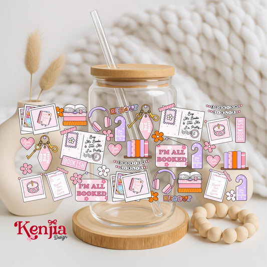 Bookish Girlie 16 OZ Glass Can With Lid & Straw /Book Moodboard Booktok / Book Lover Gift / Water Bottle / UV Dtf Libbey Wrap Transfert