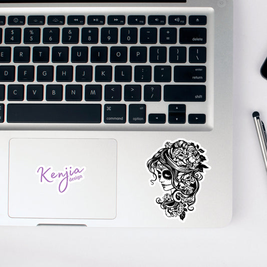 Steampunk Witch Goth Female Sugar Skull with flowers Sticker, Black and White Waterproof Dishwasher Safe Handmade Vinyl Sticker