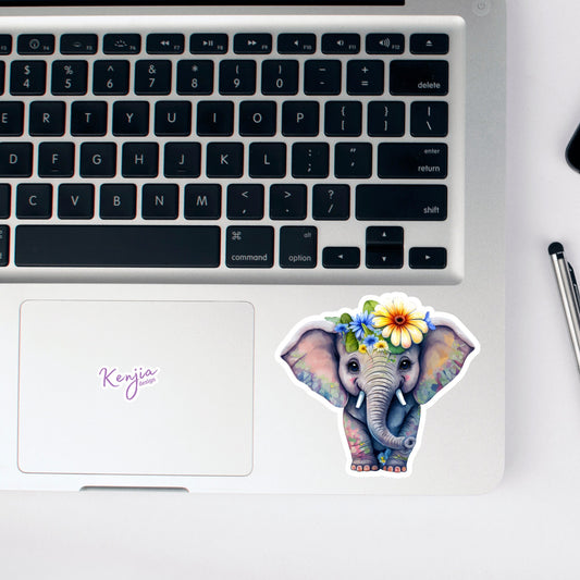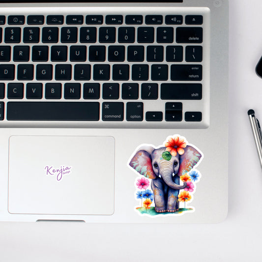 Cute handmade Vintage Baby Elephant Sticker with flowers and Watercolor Effect in Vinyl, Waterproof for planner, book , laptop stickers