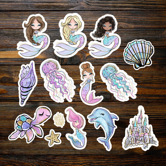 14 pcs Sticker Pack Mermaid, Jellyfish, Dolpin, Handmade cute Vinyl Stickers for gift, planner, book, laptop