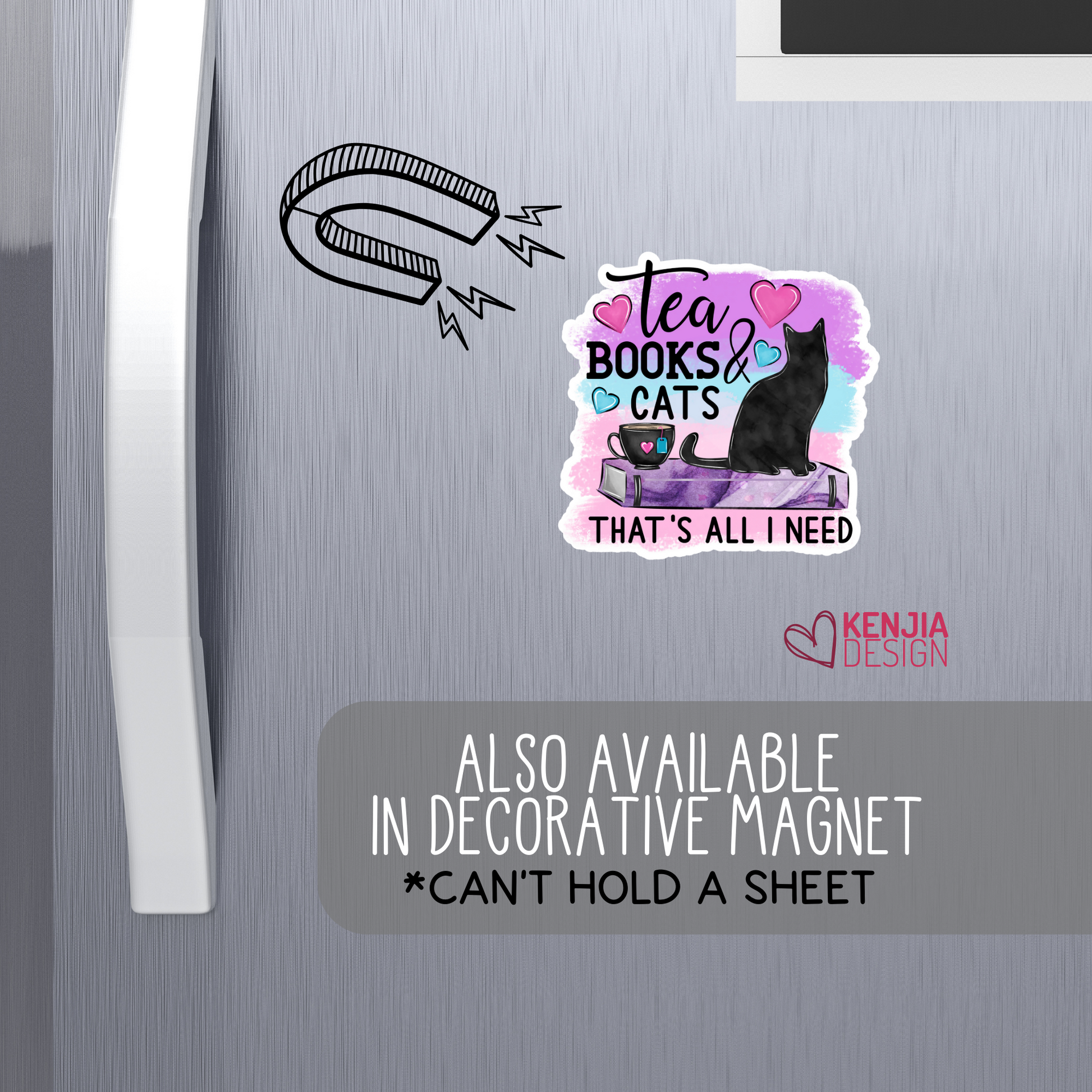 Tea Books and Cats That's All I Need Stickers and Magnets, Book Lover gift, Bookish Merch, Reading lover, Cat Stickers, Laptop Stickers