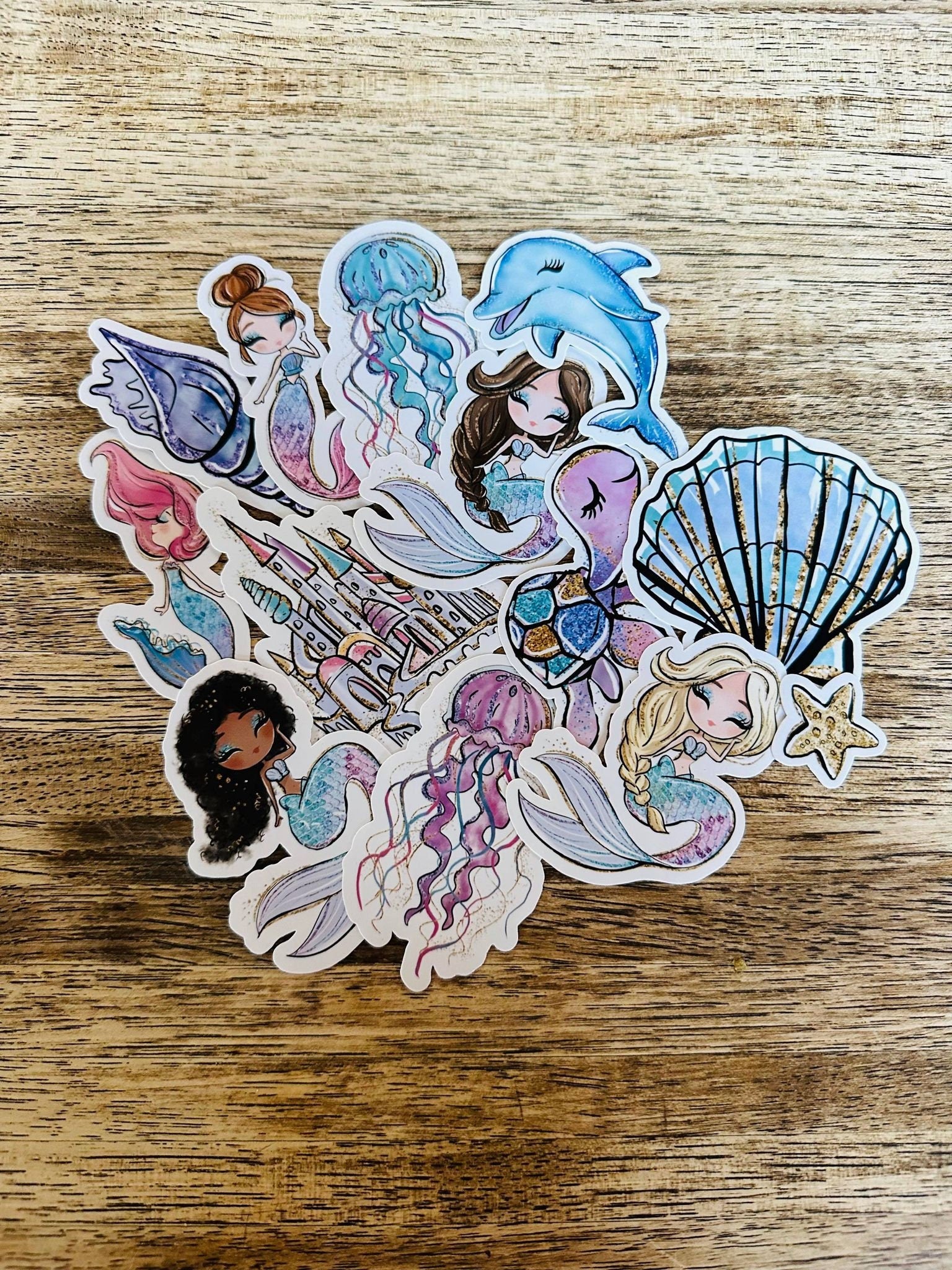 14 pcs Sticker Pack Mermaid, Dolphin, Jellyfish, Castle,Cute Girly sticker, vinyl sticker for Laptop, Notebook, Walls, Water Bottle, Mug, Phone and Case , Mirrors, Book, Scrapbooking or for your Journal, Card Making and more.